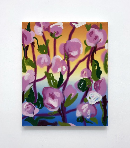 a sketching surface, a thinking space, not as an end product. In the subsequent analog process, motifs condense: floral forms, interior spaces, ornamental structures. Kiesmann’s paintings carry the